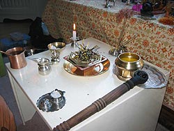 | Then I take the silver coconut with 5 leaves off the top of the kumbha, dip a leaf in the water of the kumbha, and sprinkle the water around the vedi while chanting Om klim gopijanavallabhaya namah. | |