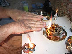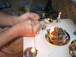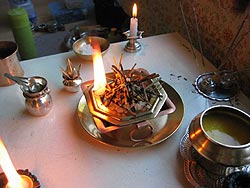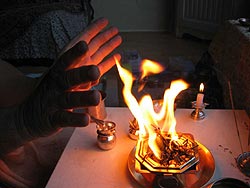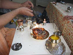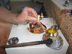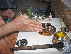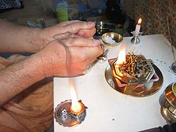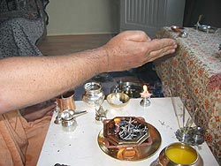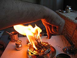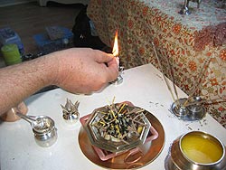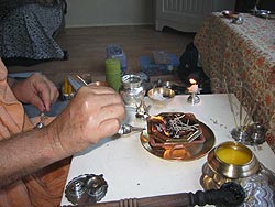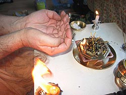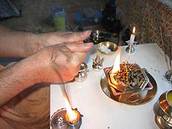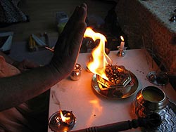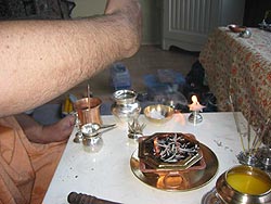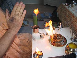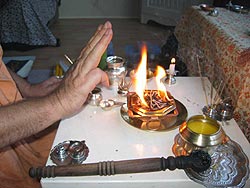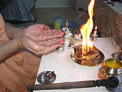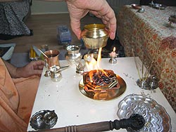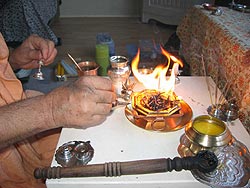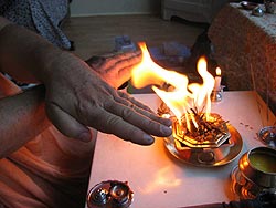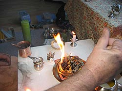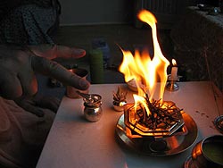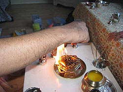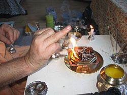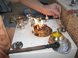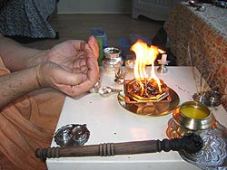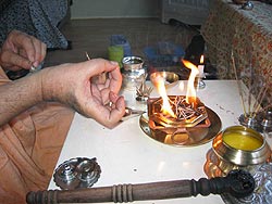 | I ingite a piece of camphor and drop it into the camphor at the southeast of the vedi. I chant: om kravyadam agnim prahinomi duram yamarajyam gacchatu ripravahah. This mantra is for casting away the inauspicious aspect of fire. | |