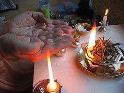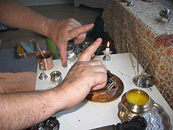 | Showing cakra mudra and chanting om astraya phat! | Snapping fingers 8 times in 8 directions around fire. |
