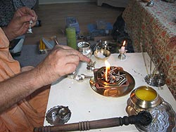 | Now I worship the fire with mudra and water offerings. I chant etat-padyam om sri vaisnave namah and with the silver spoon offer a drop of water from the Lord's acamana pot onto the brass base place of the vedi. I meditate upon washing the lotus feet of Lord Vaisnava Agni. | |