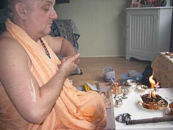 Vyasta Samasta Mahavyahrti Homa again. Then Vaisnava homa, which I've condensed to the om ajnana timirandhandasya mantra (one ahuti or offering in the fire), the two Srila Prabhupada pranama mantras (two ahutis), the vanca-kalpa verse (one ahuti), the Panca-tattva mahamantra (one ahuti) and the Hare Krsna mahamantra (one ahuti).